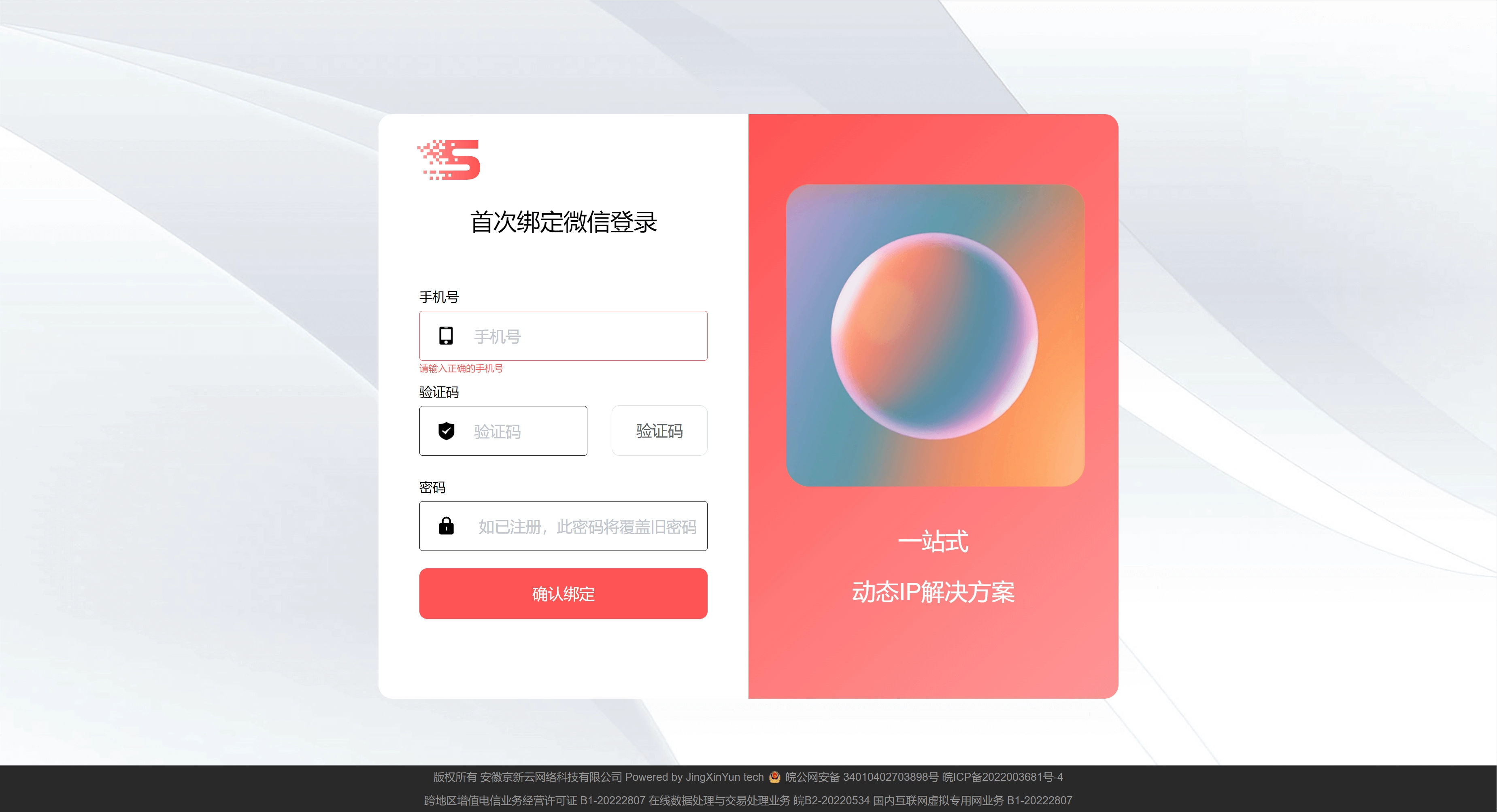 登录页面点击【微信】图标按钮,跳转到新页面使用微信扫描登录二维码,首次登录需要在微信关注公众号(京新云S5代理),关注成功在网站输入手机号码、短信验证码、密码绑定微信登录;绑定成功后,该账号只需使用微信扫码即可登录。
