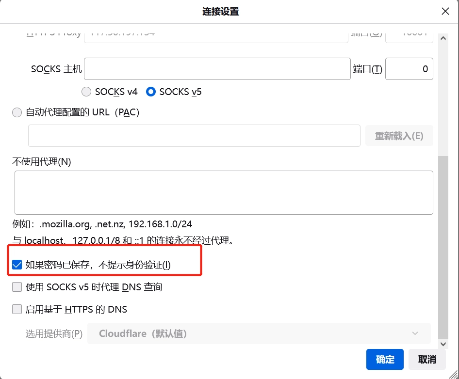点击手动代理设置;输入提取的代理ip和端口(为所有协议使用相同代理服务器打勾);如果密码已保存,不提示身份验证打勾,点击确定