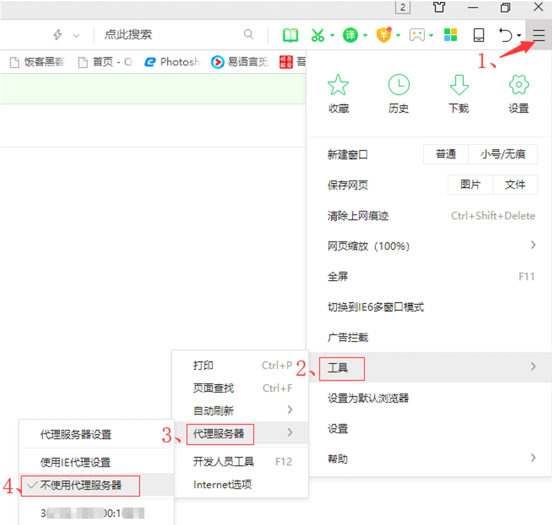 点击右上角菜单;点击工具;点击代理服务器‘选择不使用代理服务器