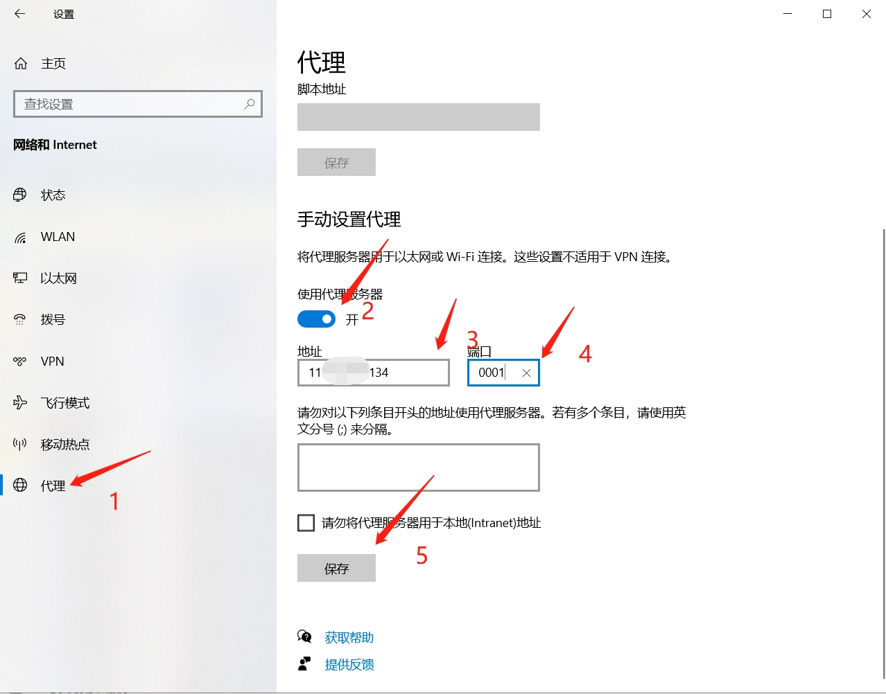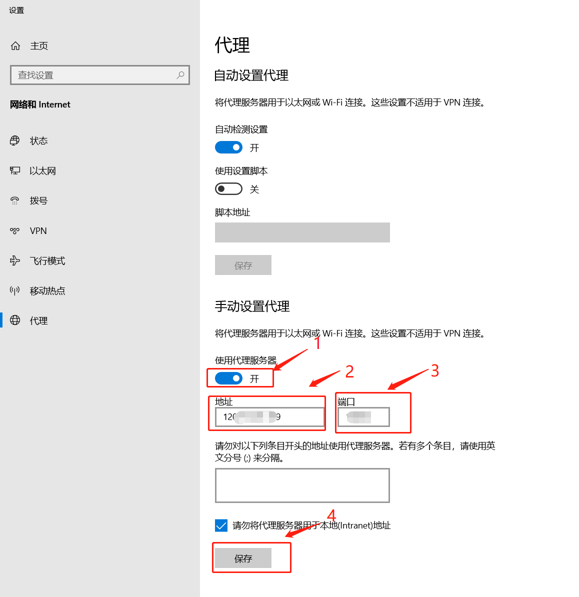 使用代理服务器选择为开;输入ip和端口;点击保存。