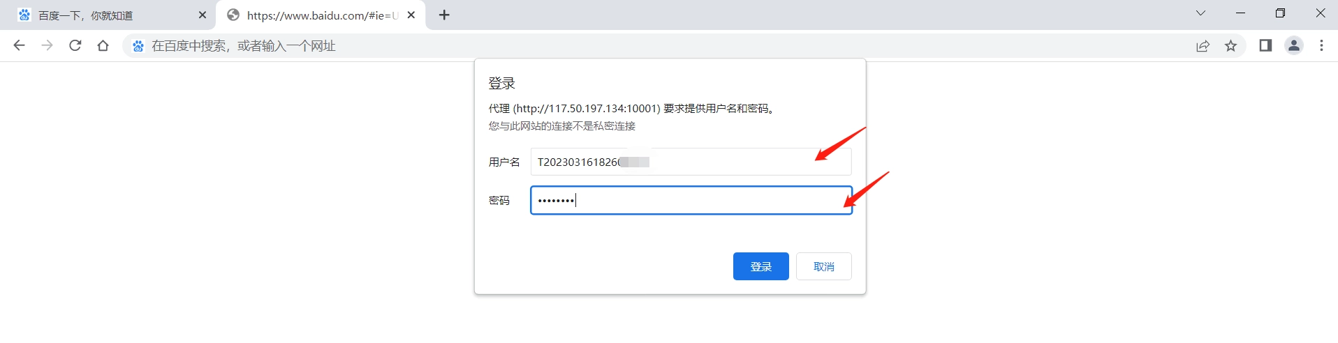 【注】第一次配置好代理可能会出现重新输入用户名密码的弹窗,重新填写正确的代理用户名、密码即可。