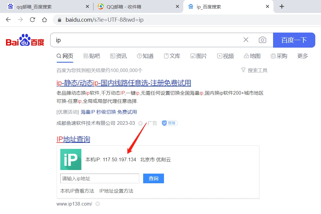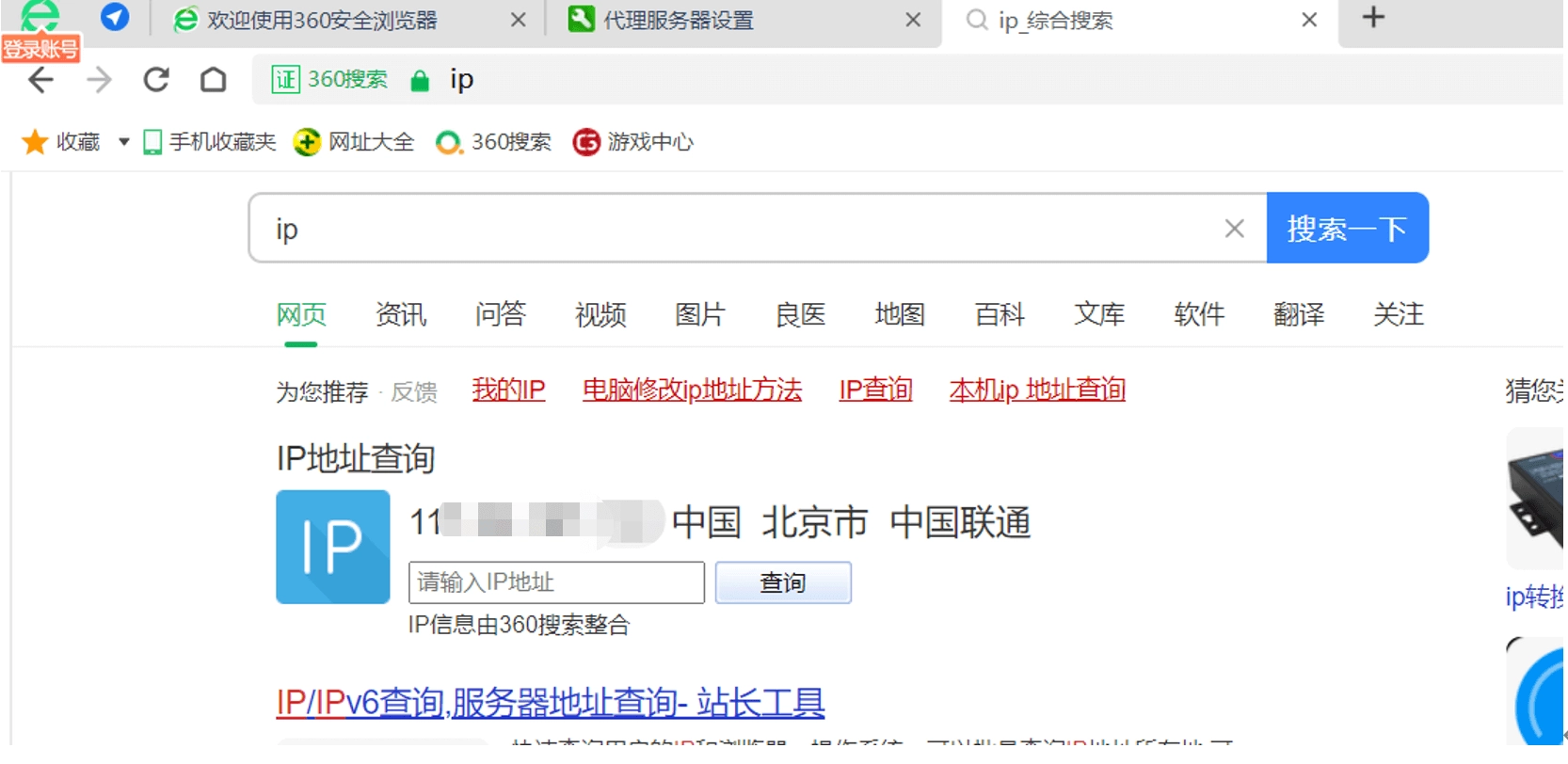打开浏览器(百度)网站上搜索“IP”出现登录代理信息,点击登录查看ip是否和设置的代理ip相同,相同则为设置成功