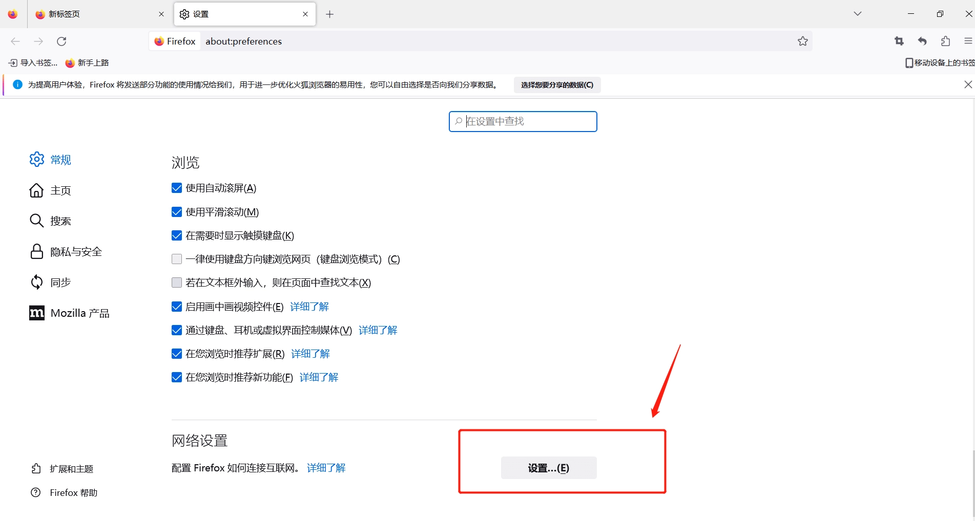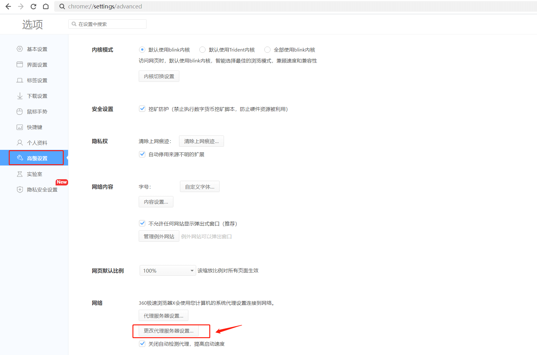 在【设置】页面点击【高级设置】,在网络模块点击【更改代理服务器设置】按钮。