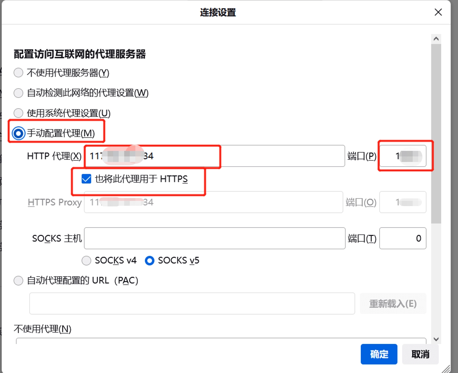 点击手动代理设置;输入提取的代理ip和端口(为所有协议使用相同代理服务器打勾);如果密码已保存,不提示身份验证打勾,点击确定