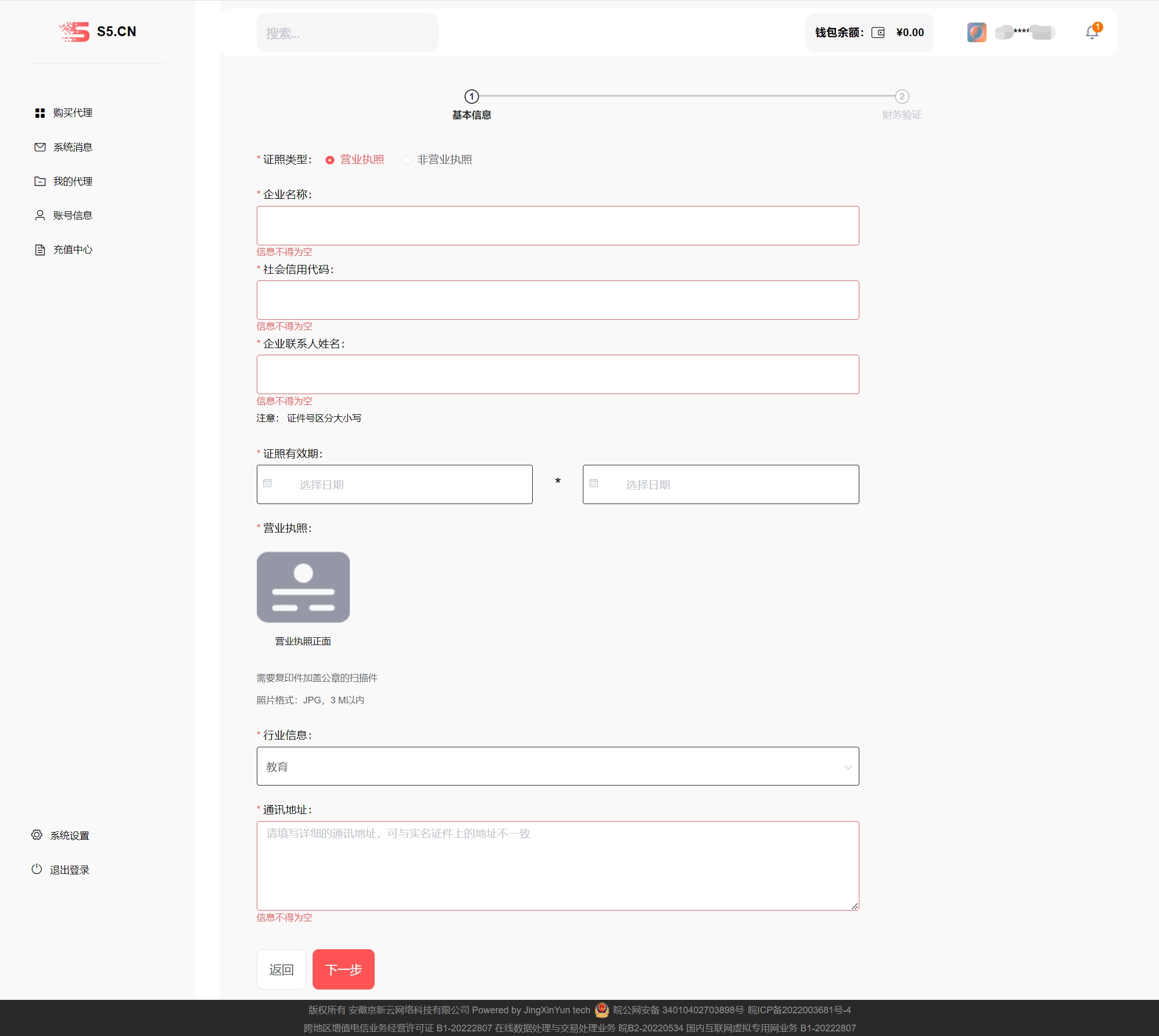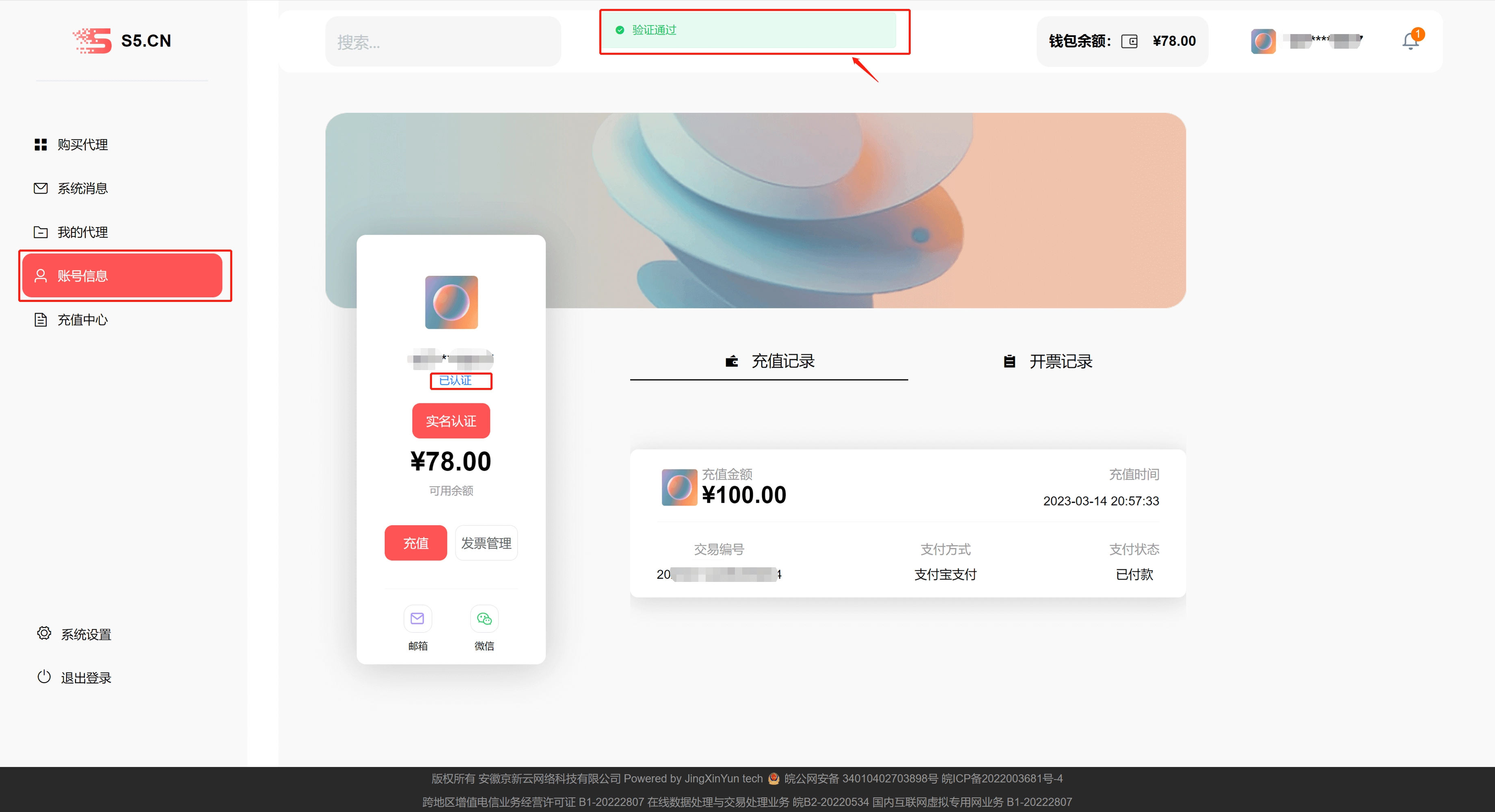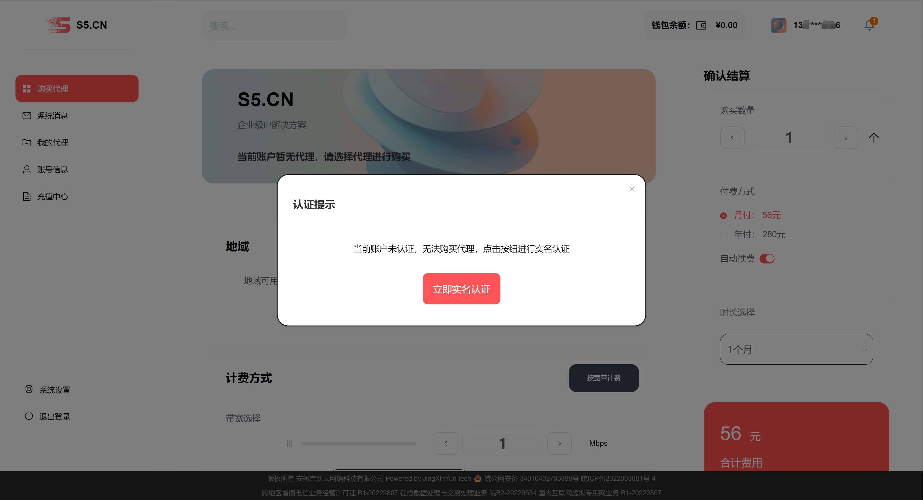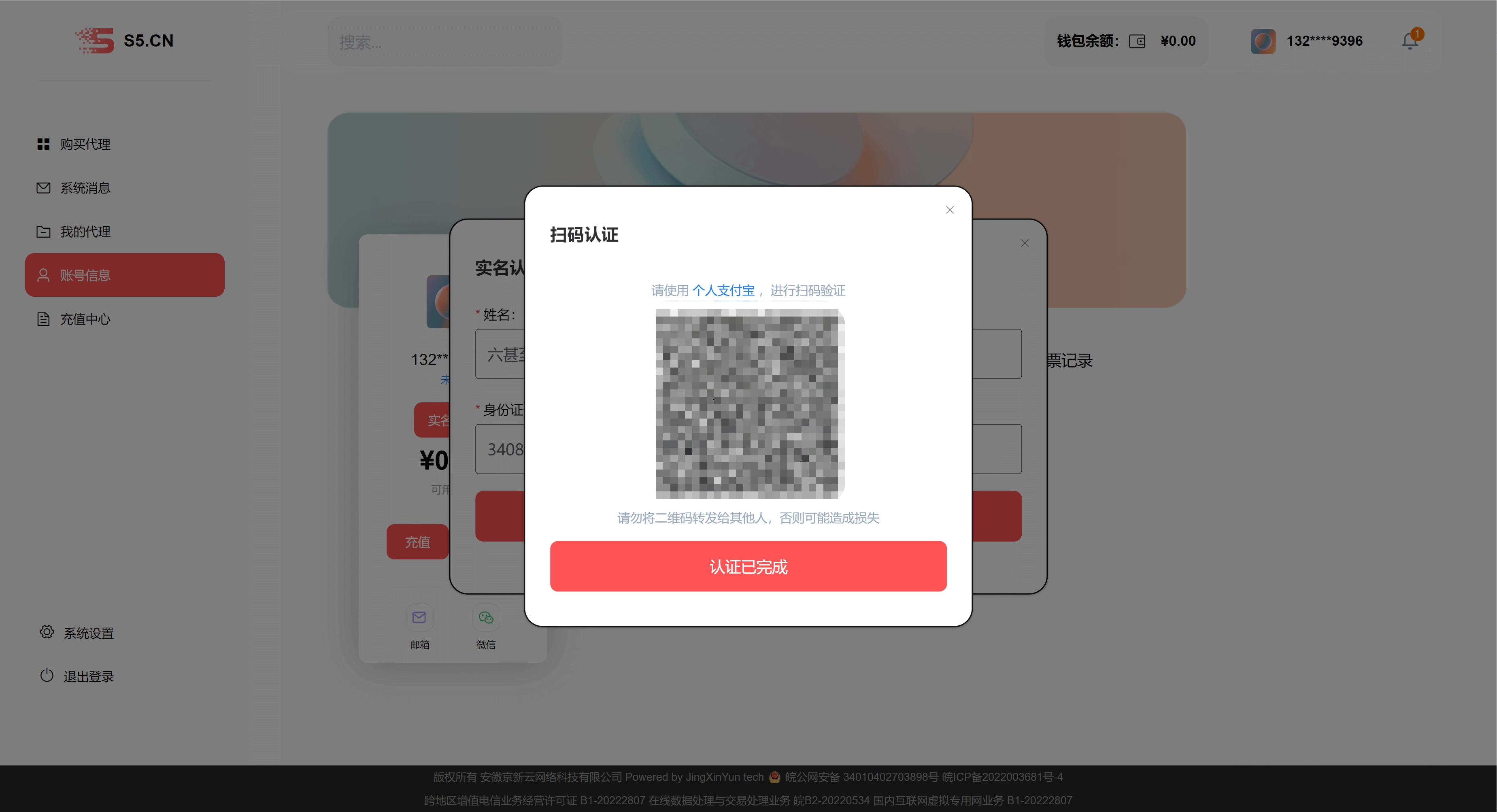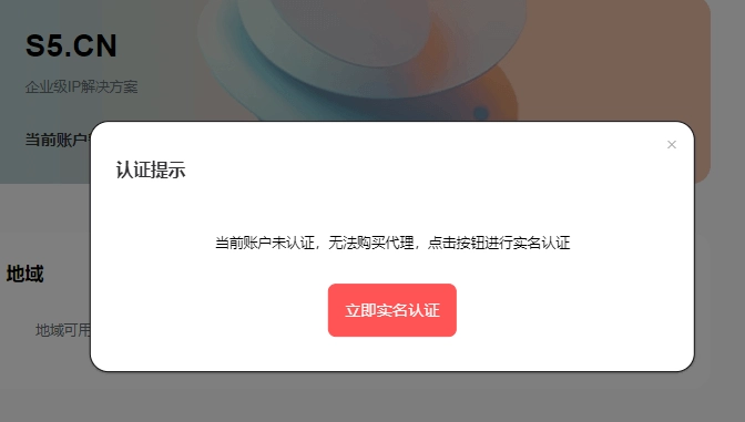 购买并使用代理需要进行实名认证,未进行实名认证的用户禁止使用该代理;实名认证详情请阅读隐私协议(https://s5.cn/privacyProtocol/) 。