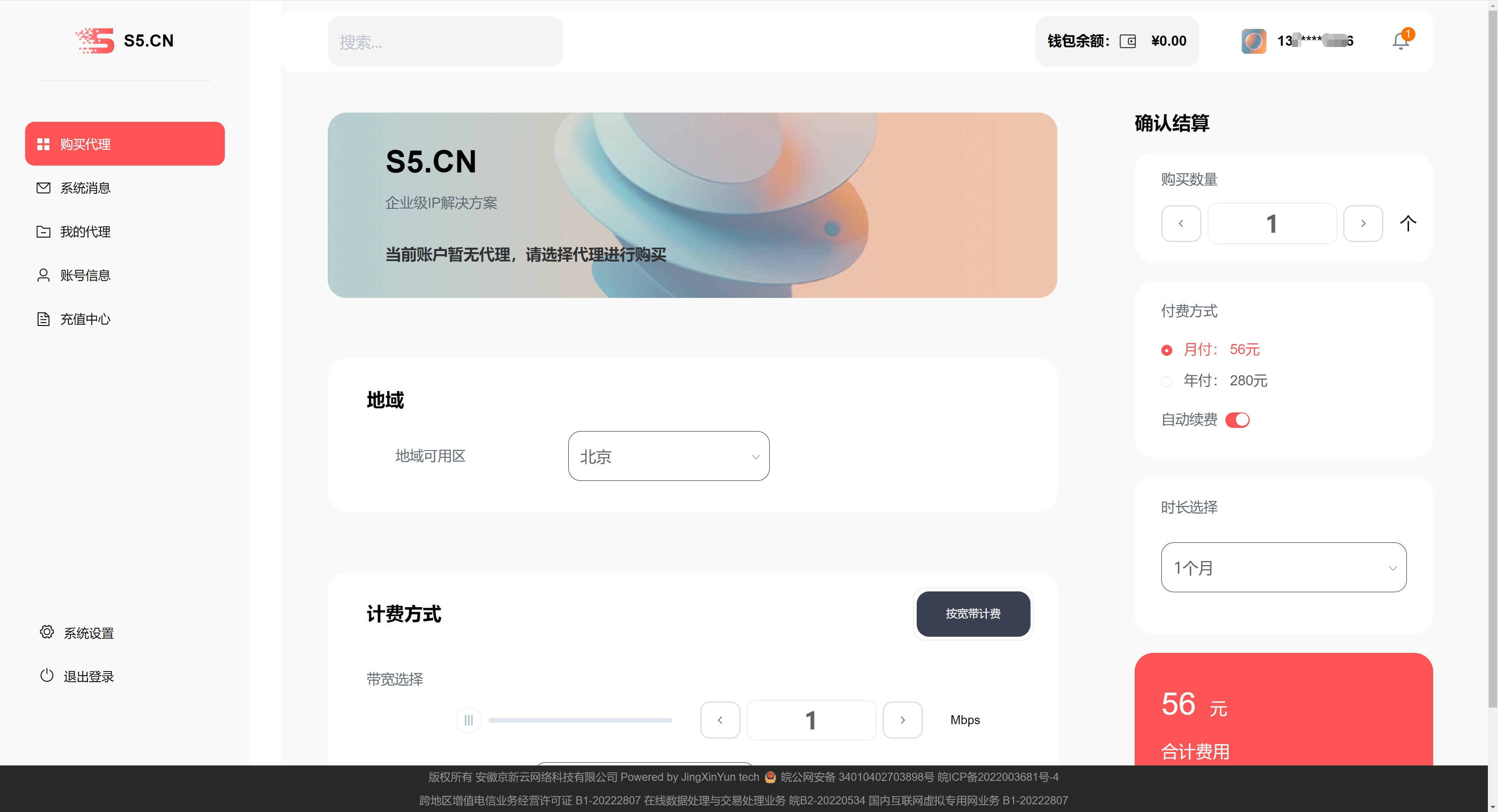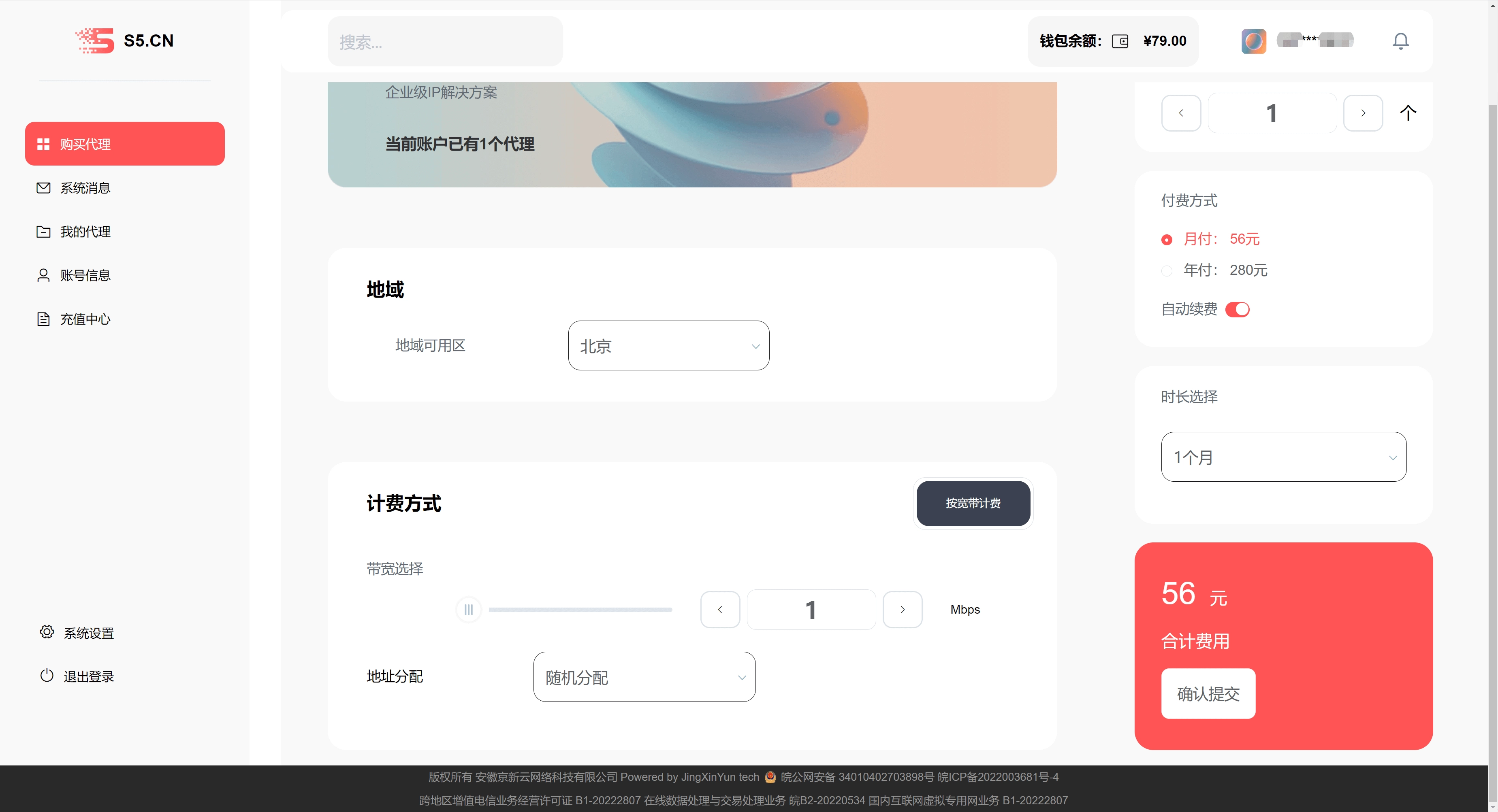 在【购买代理】页面,选择代理区域、带宽、数量、计费方式、自动续费,使用时长,点击【确认提交】。购买成功后页面自动跳转到【我的代理】列表页,新购买的代理1分钟内自动开通成功。注:需要先充值,再购买代理;未实名认证的用户购买不了代理。