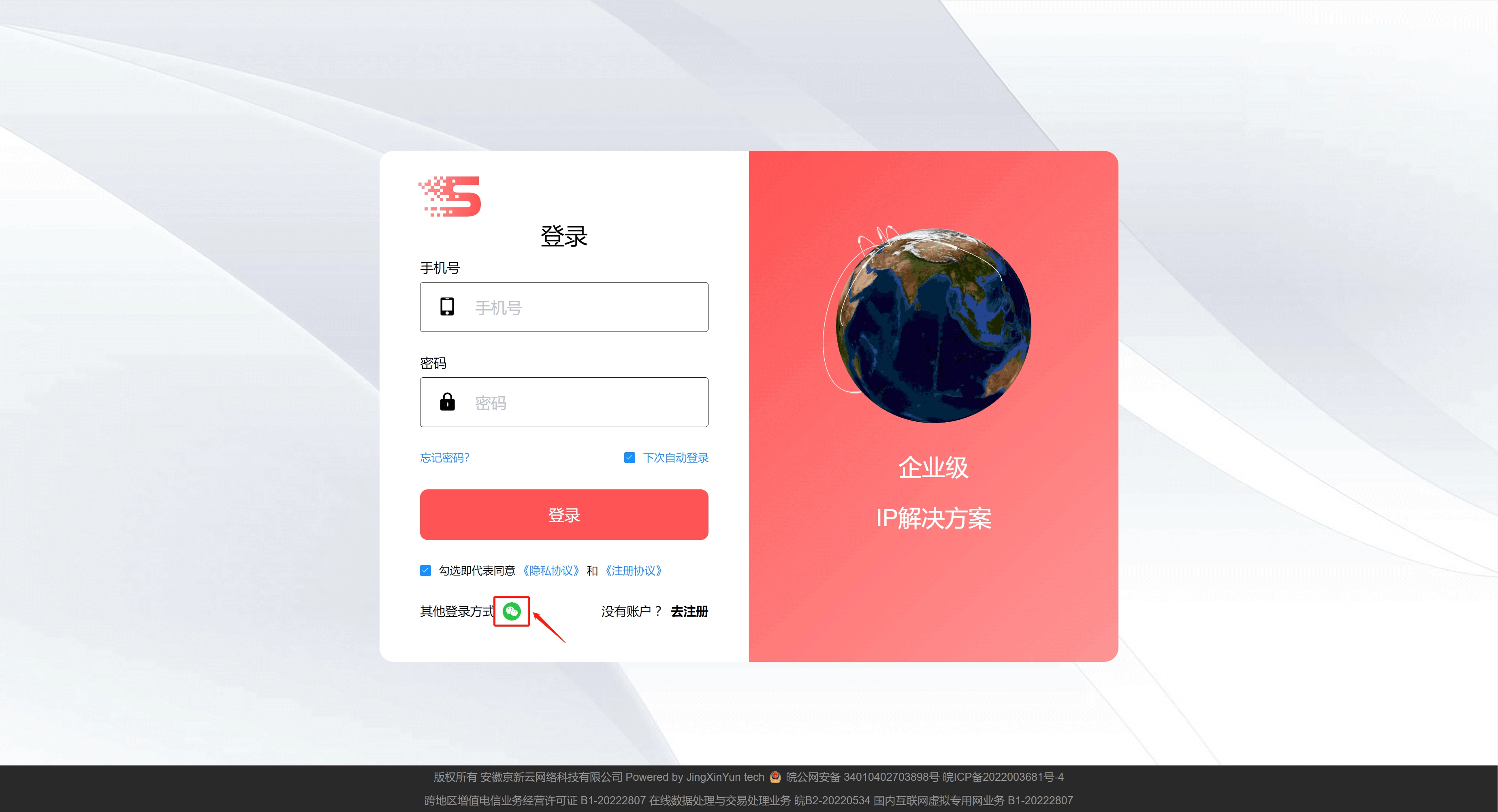 登录页面点击【微信】图标按钮,跳转到新页面使用微信扫描登录二维码,首次登录需要在微信关注公众号(京新云S5代理),关注成功在网站输入手机号码、短信验证码、密码绑定微信登录;绑定成功后,该账号只需使用微信扫码即可登录。