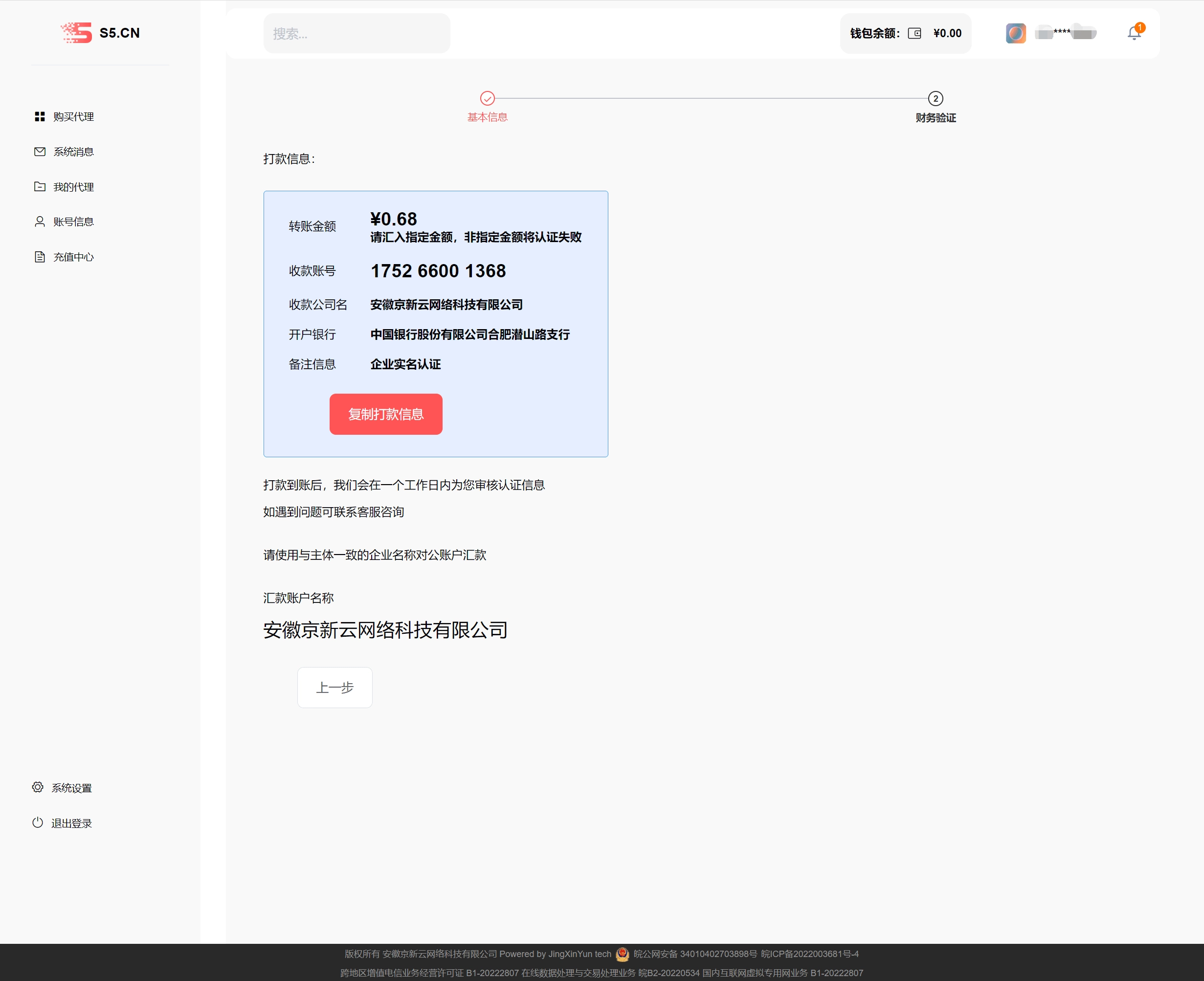 在企业认证页面输入和上传企业相关信息点击【下一步】进行财务验证,使用企业账户公对公汇入指定金额,用于企业认证核实;由于企业认证需要人工审核,会在一个工作日内完成审核。