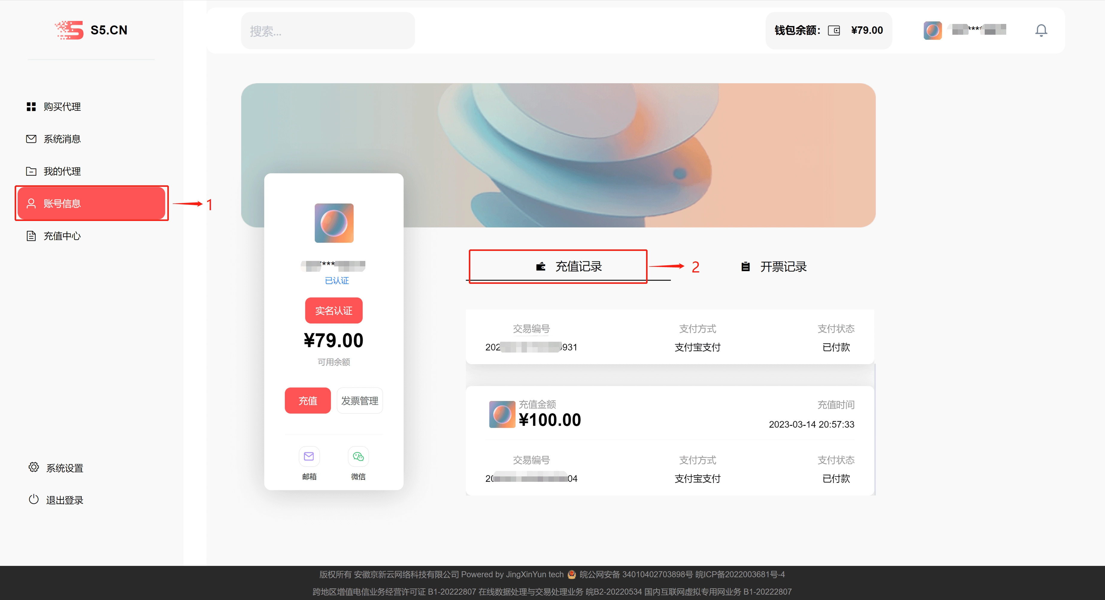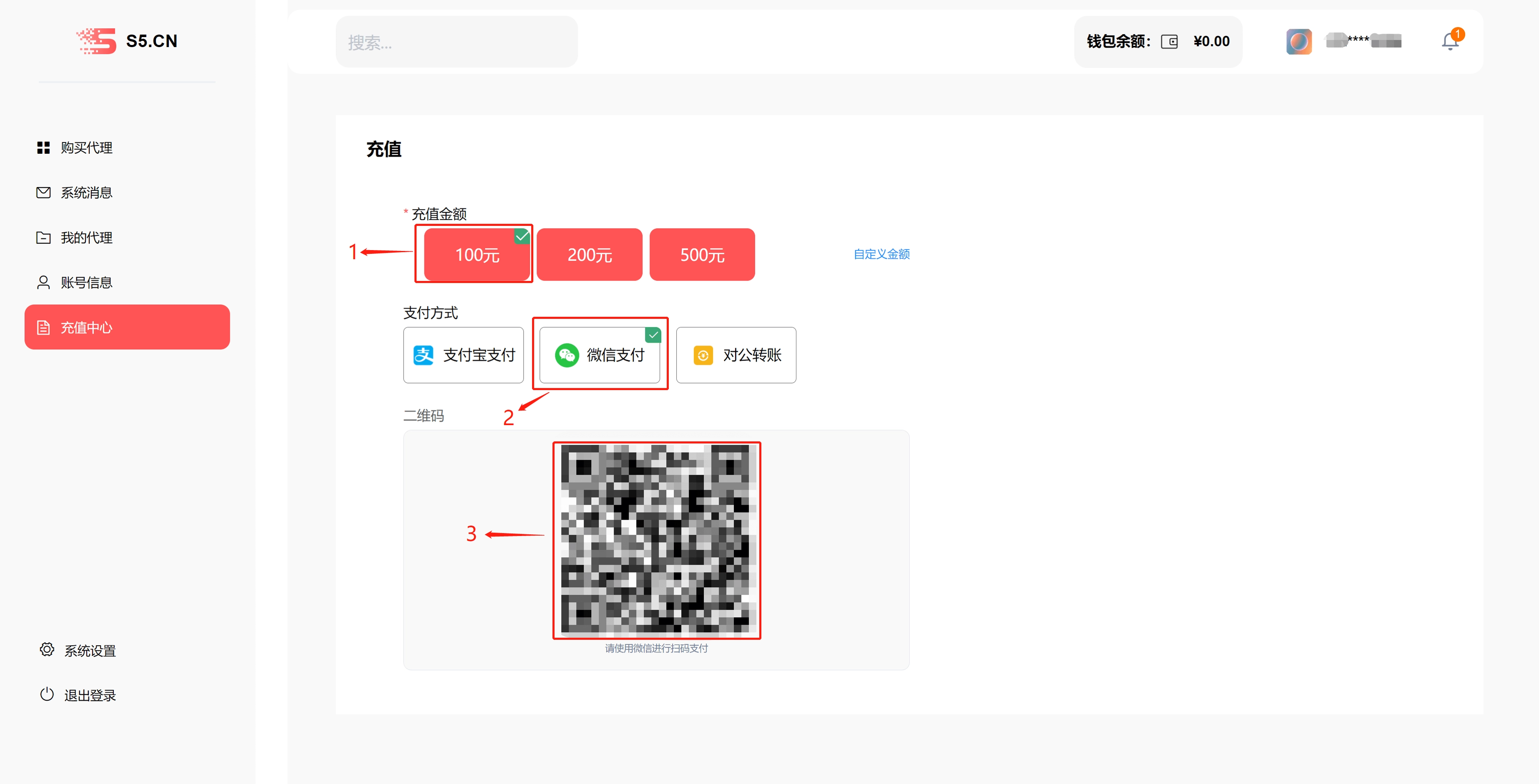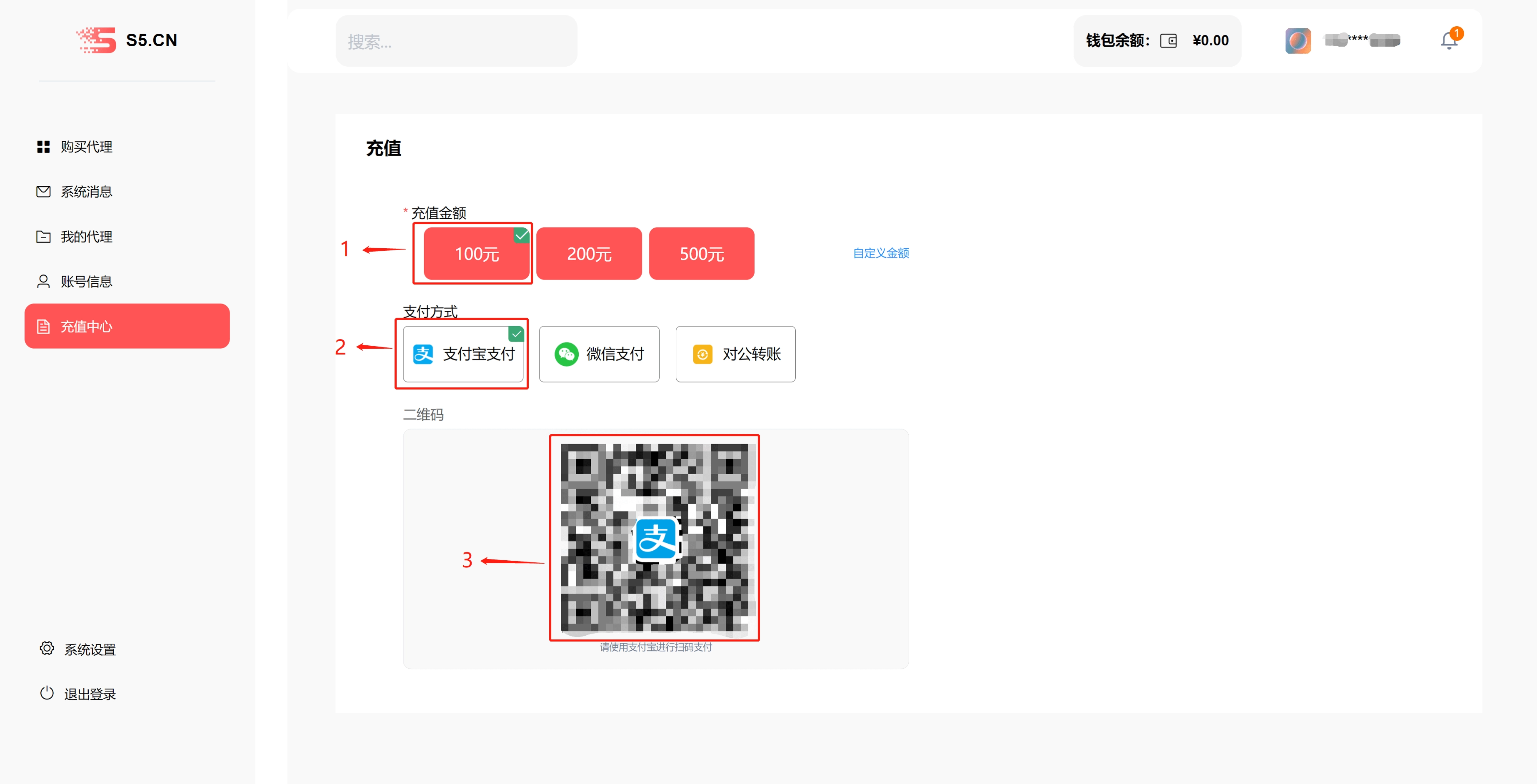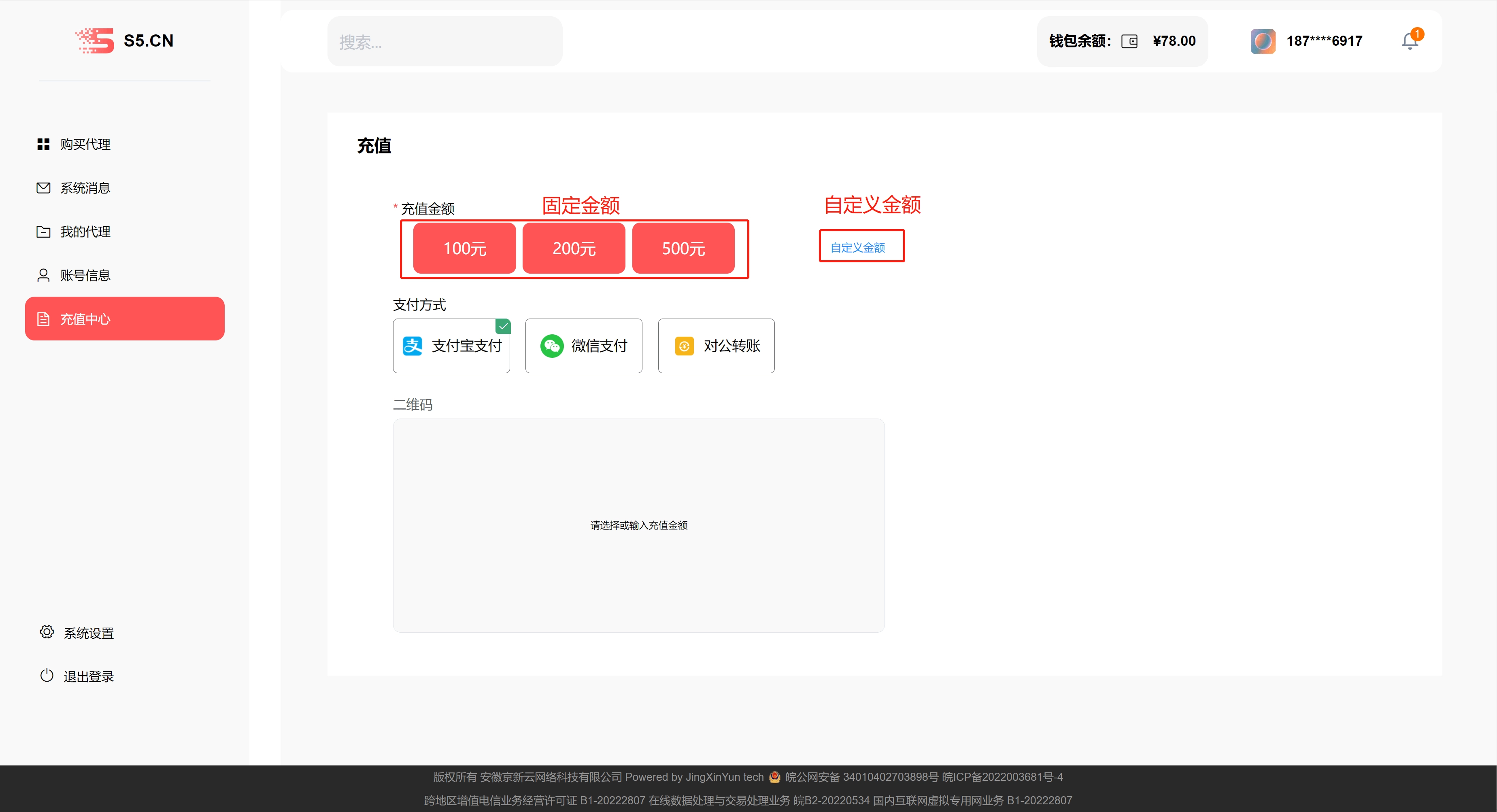 在充值中心选择需要充值的金额,支付方式选择支付宝支付,使用手机支付宝扫码支付二维码充值即可,充值成功实时到账。用户即可购买所需代理。