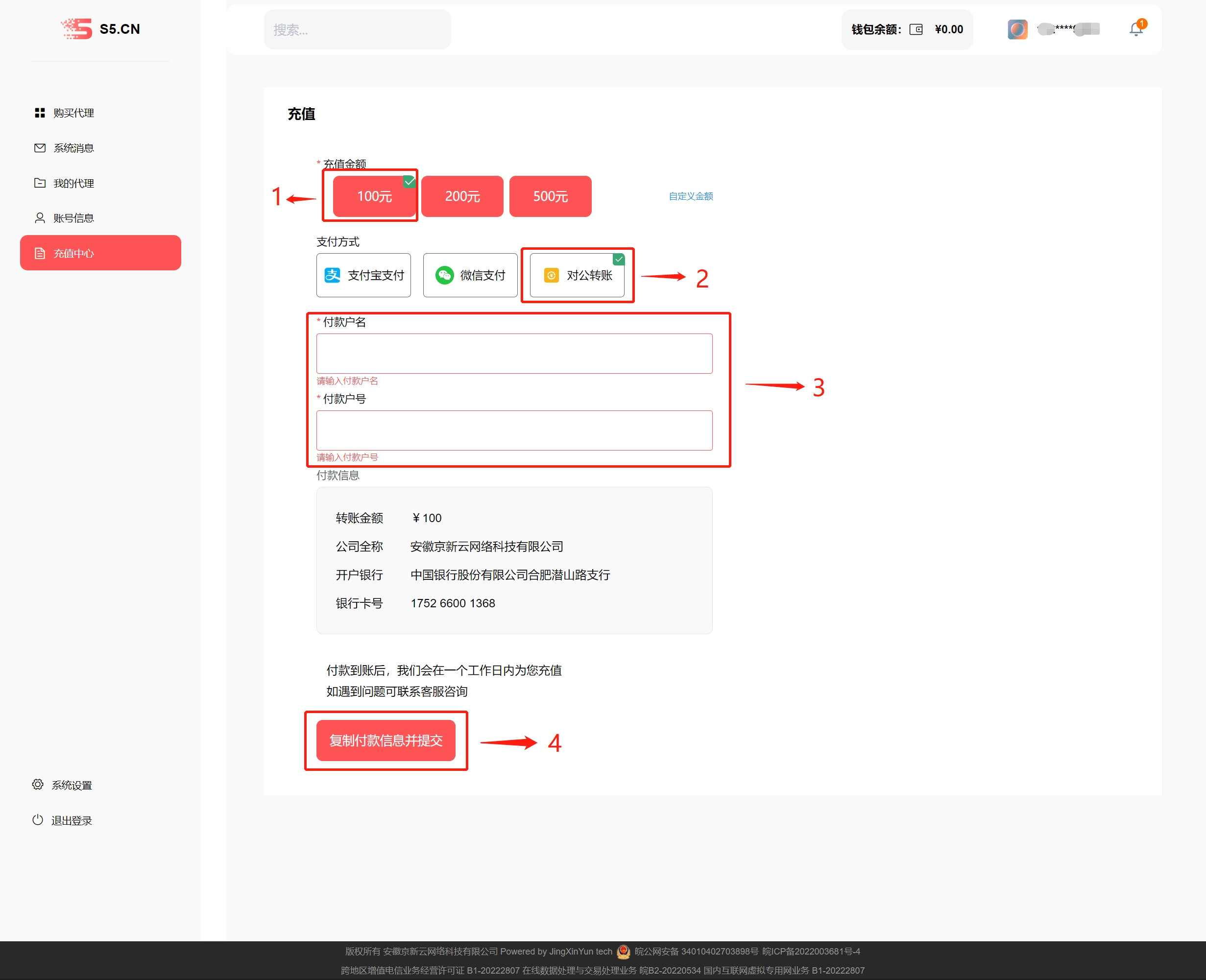 在充值中心选择需要充值的金额,支付方式选择对公转账,输入付款户名、付款户号,并点击【复制付款信息并提交】按钮。由于对公转账需要人工审核,会在一个工作日内为支付账户充值。注意:可使用任意银行卡汇款,实际汇款户名必须与以下任意户名一致,才可充值到账。对公转账已实际回款金额为主。