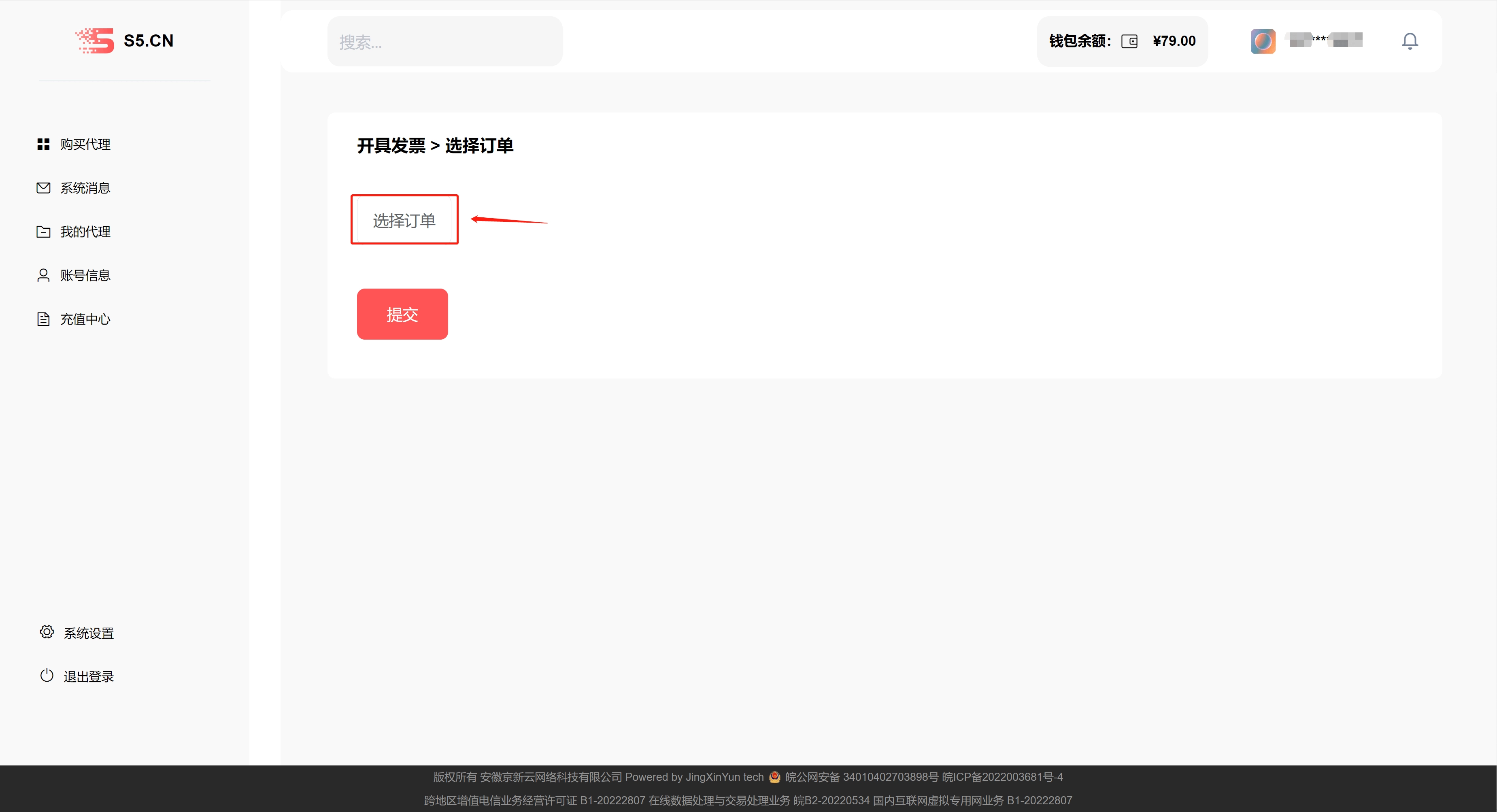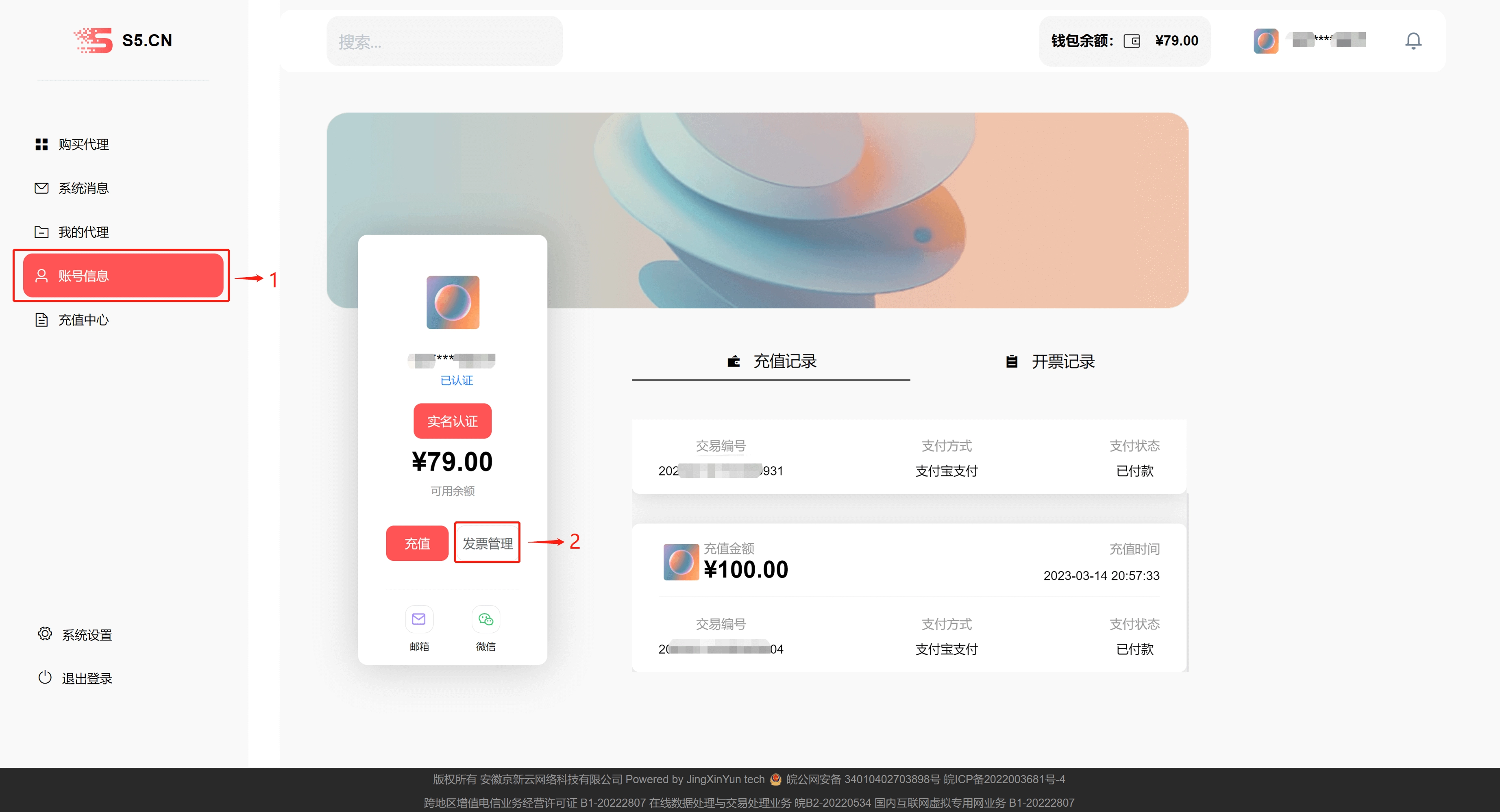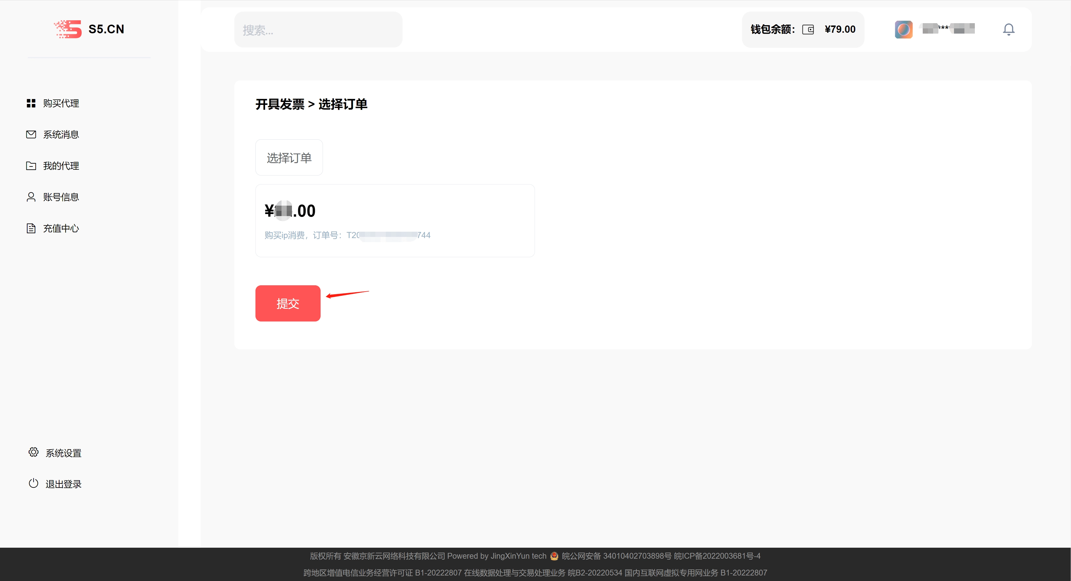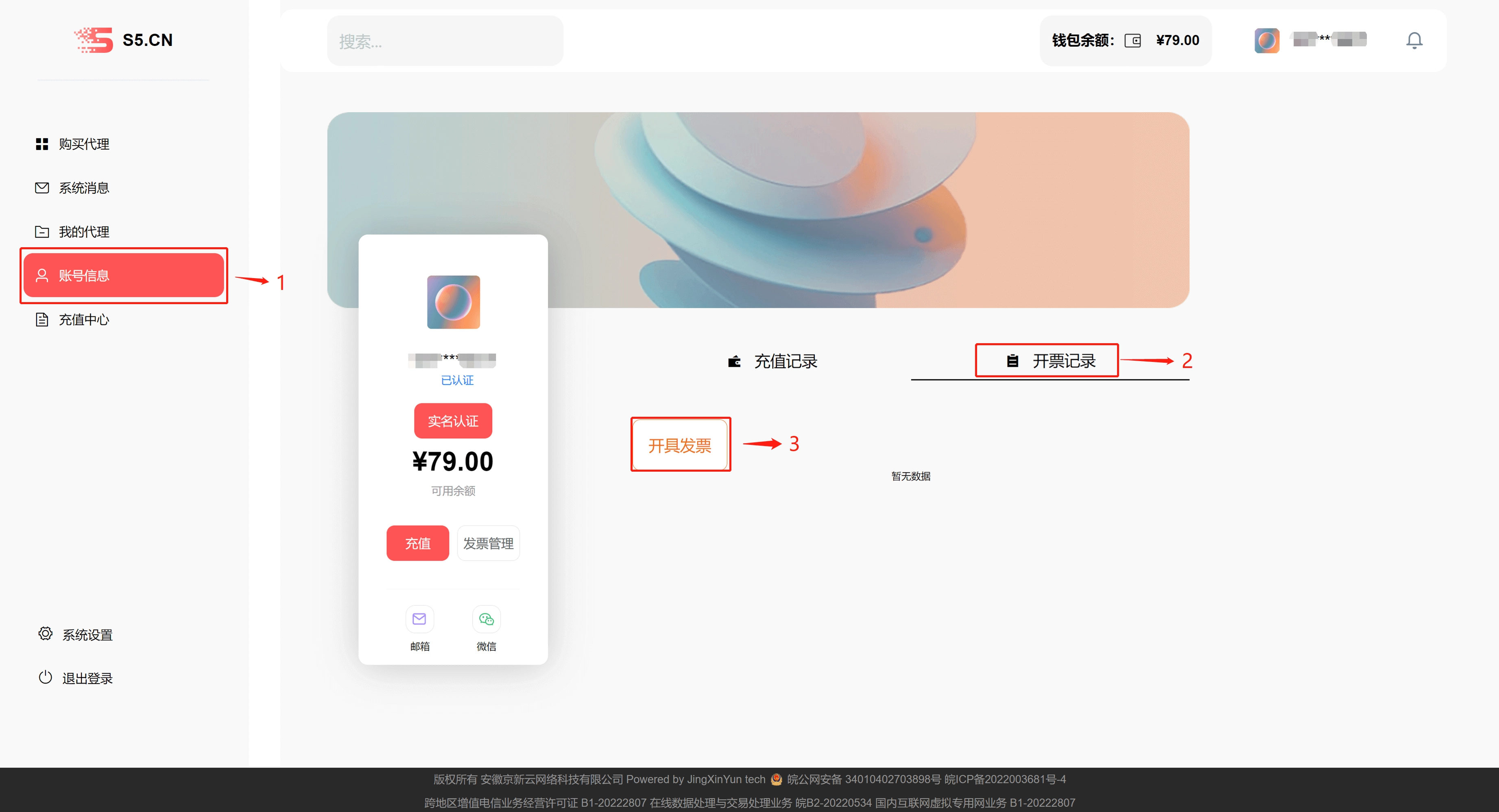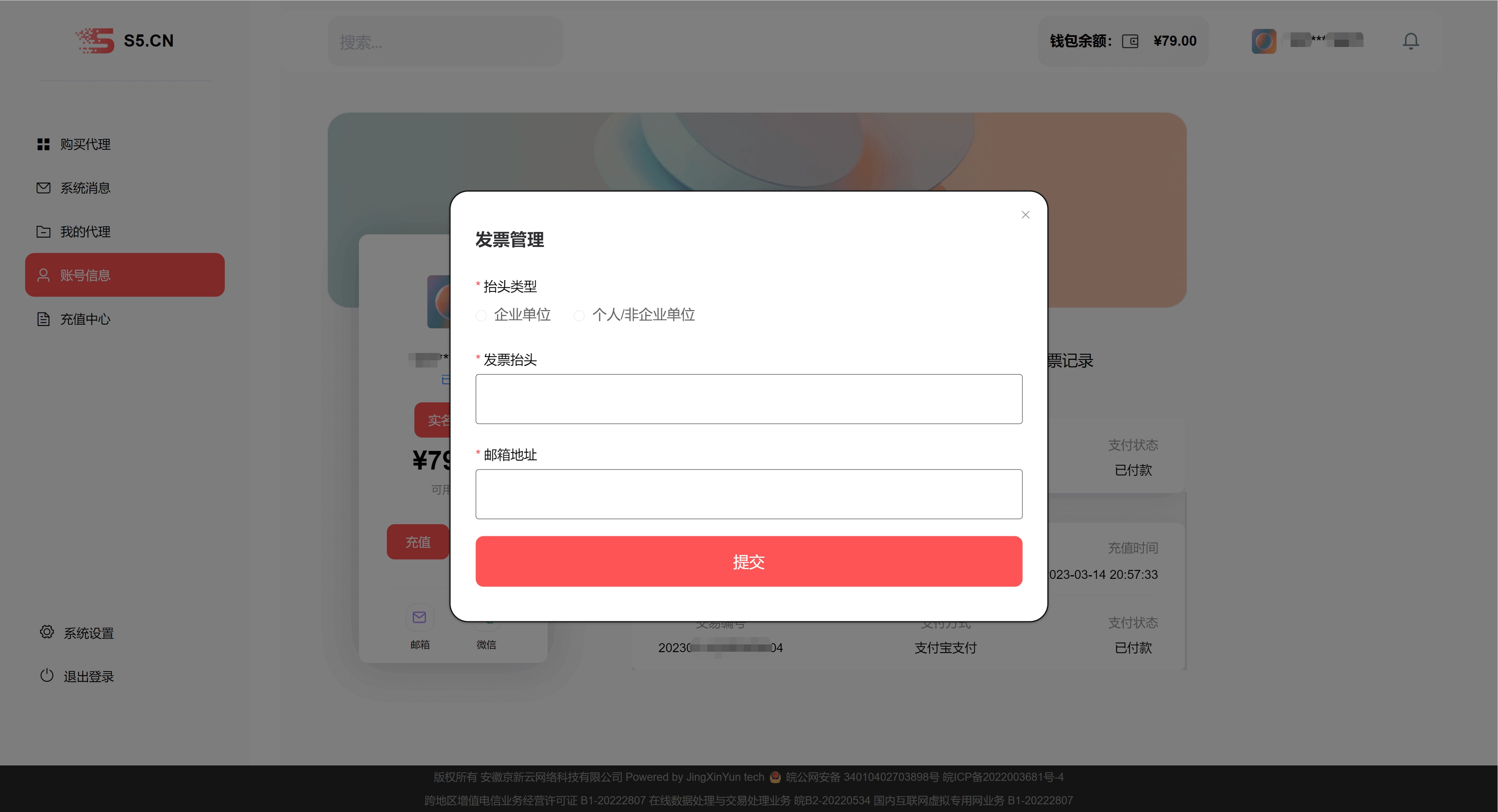 在【账号信息】页面点击【发票管理】按钮,在弹窗内输入发票信息。