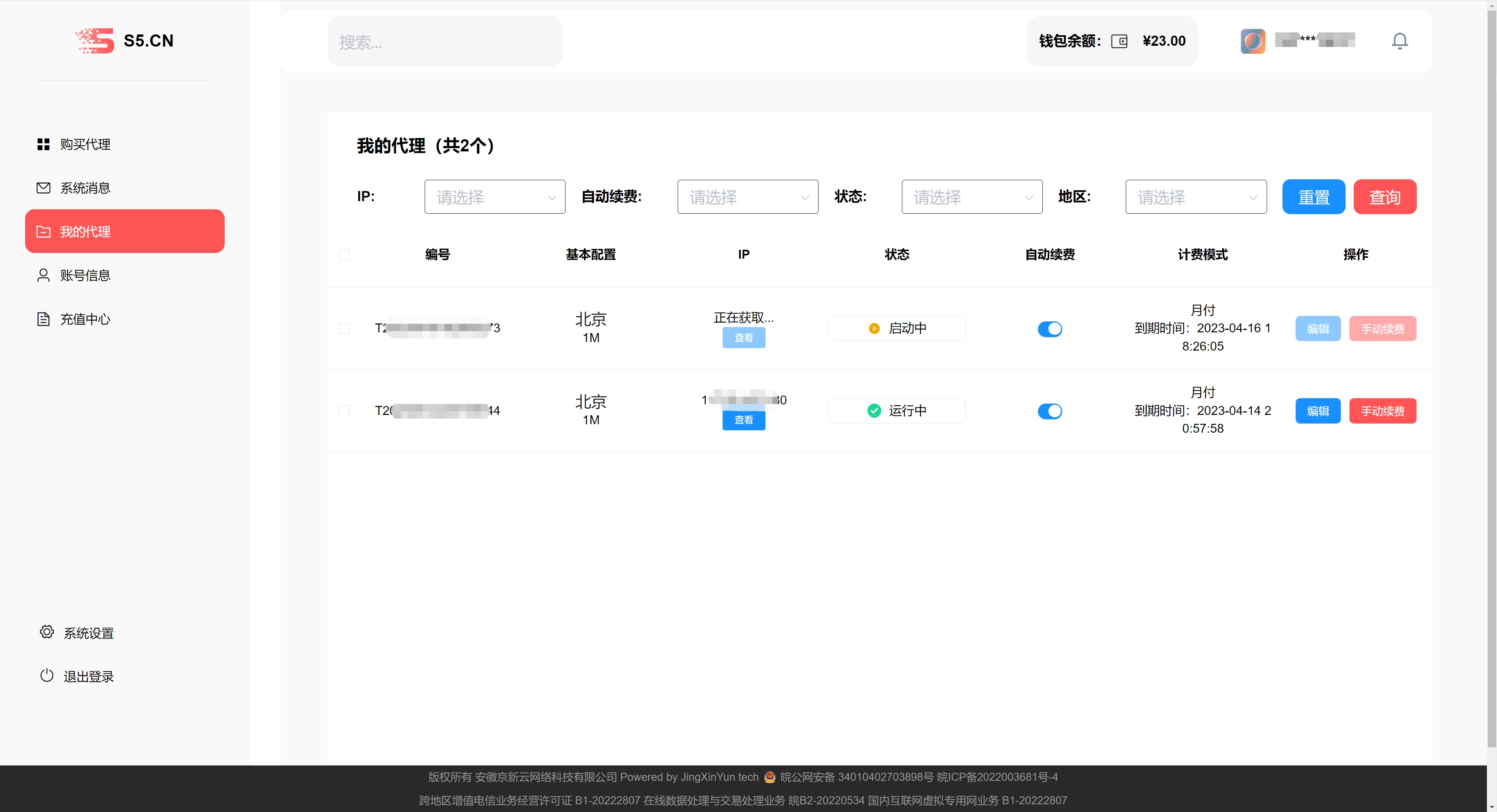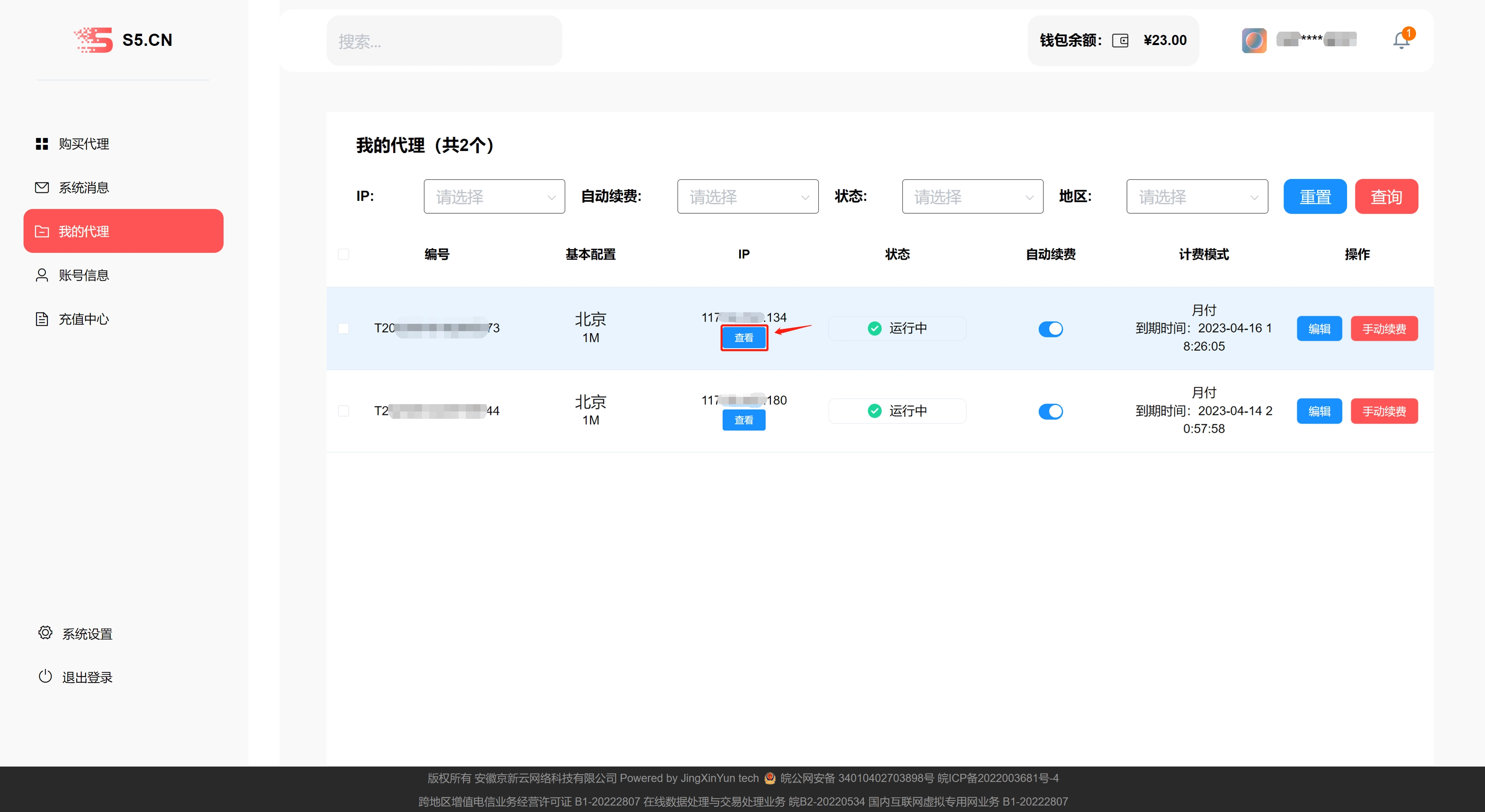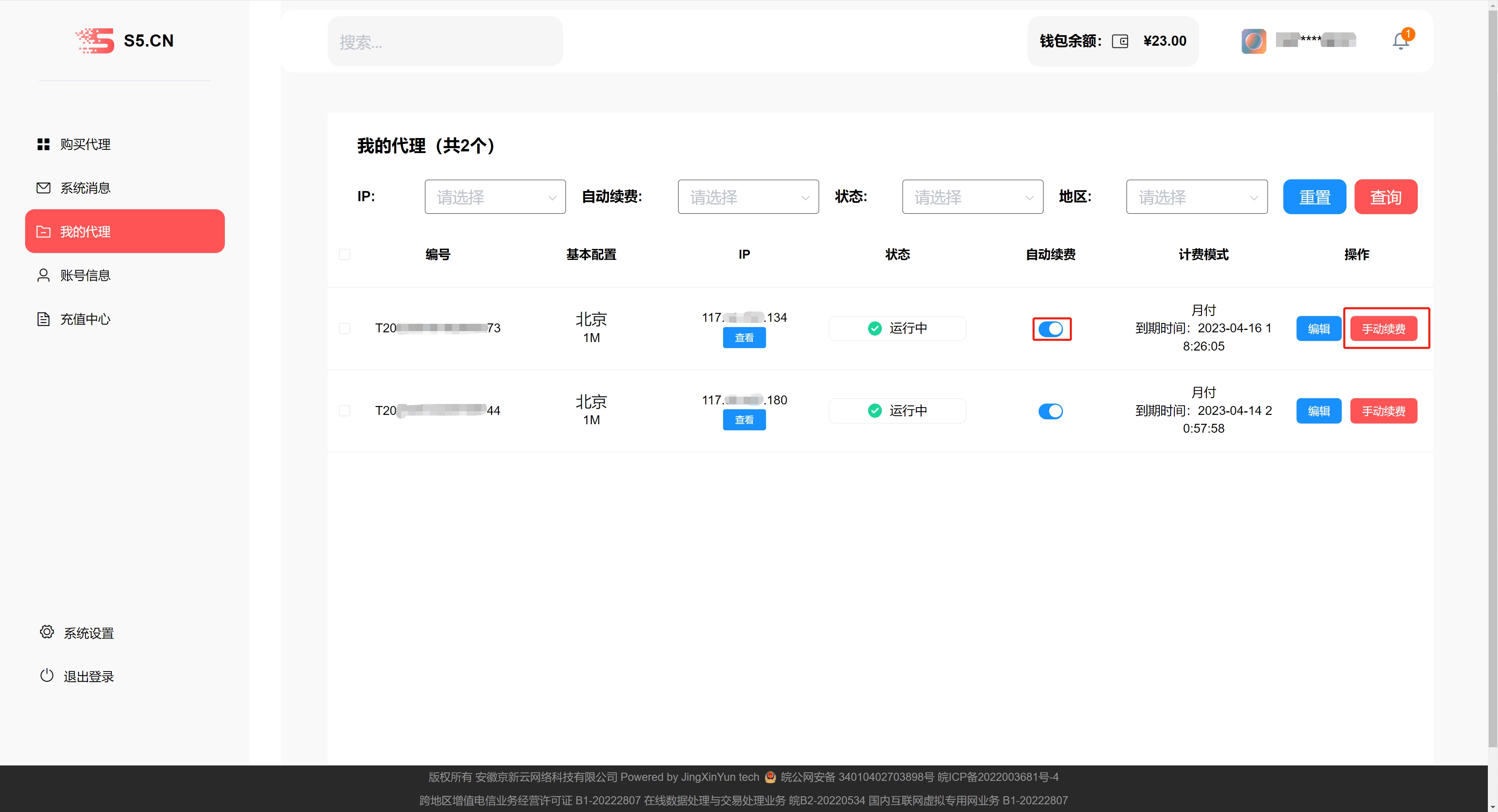 在【我的代理】页面可以开通自动续费或手动续费。余额不足不能进行续费,需充值后在续费。代理快到期会通过短信提醒用户。