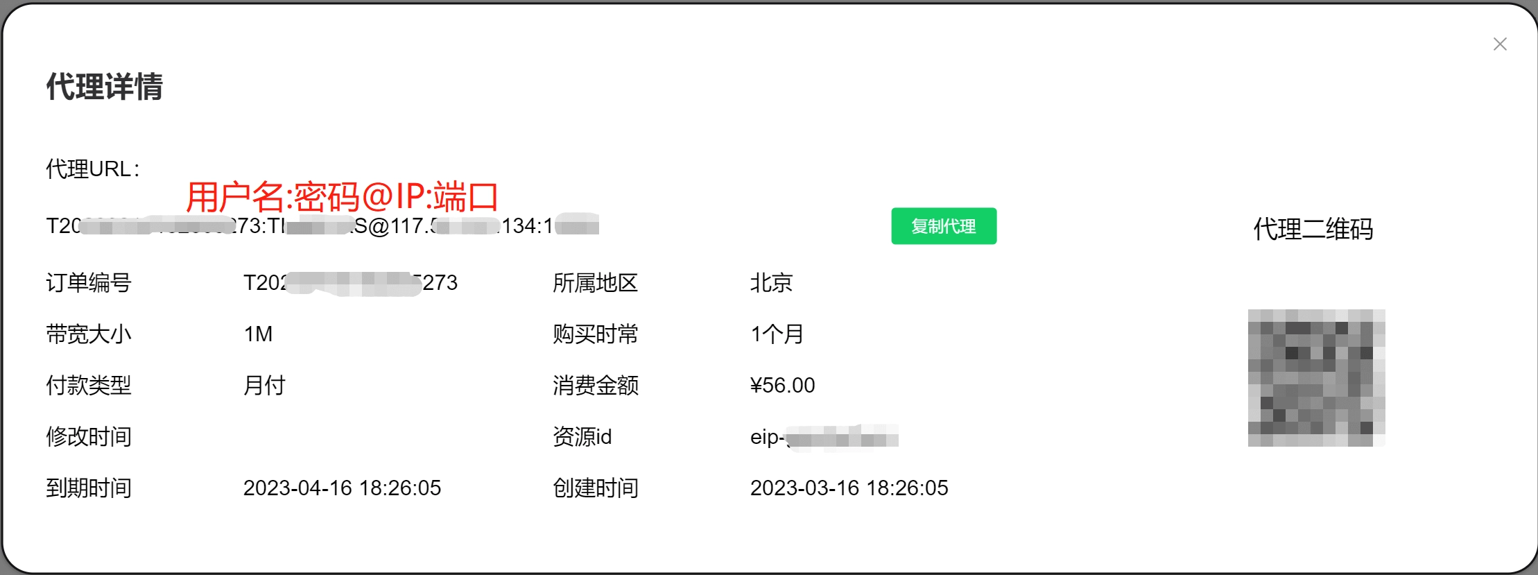在【我的代理】页面点击【查看】按钮,即可查看代理信息。开通的代理默认支持HTTP和Socks5协议。
