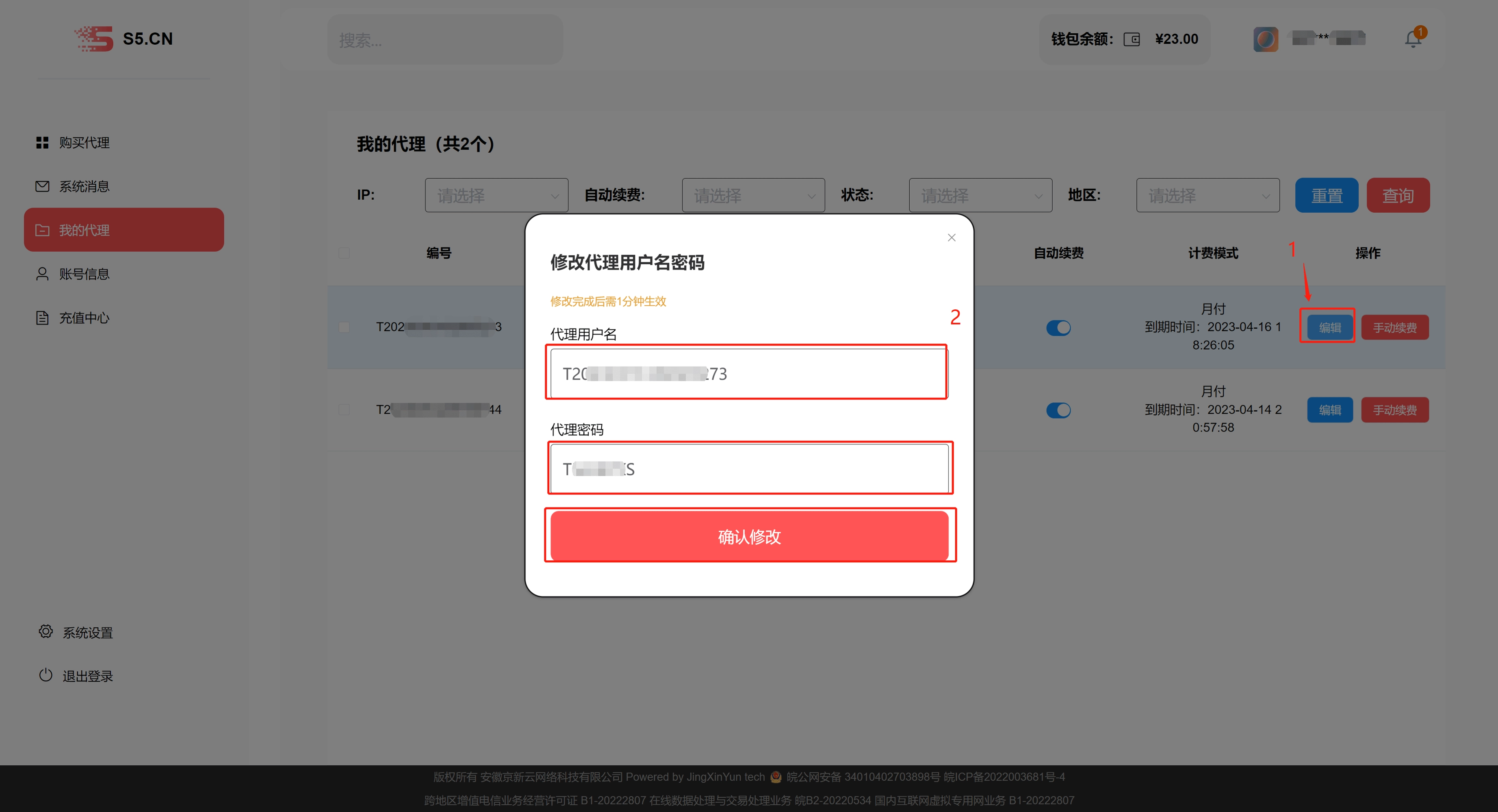 在【我的代理】页面点击【编辑】按钮,在【编辑】页面可以修改代理用户名和密码,点击保存后,30秒生效。