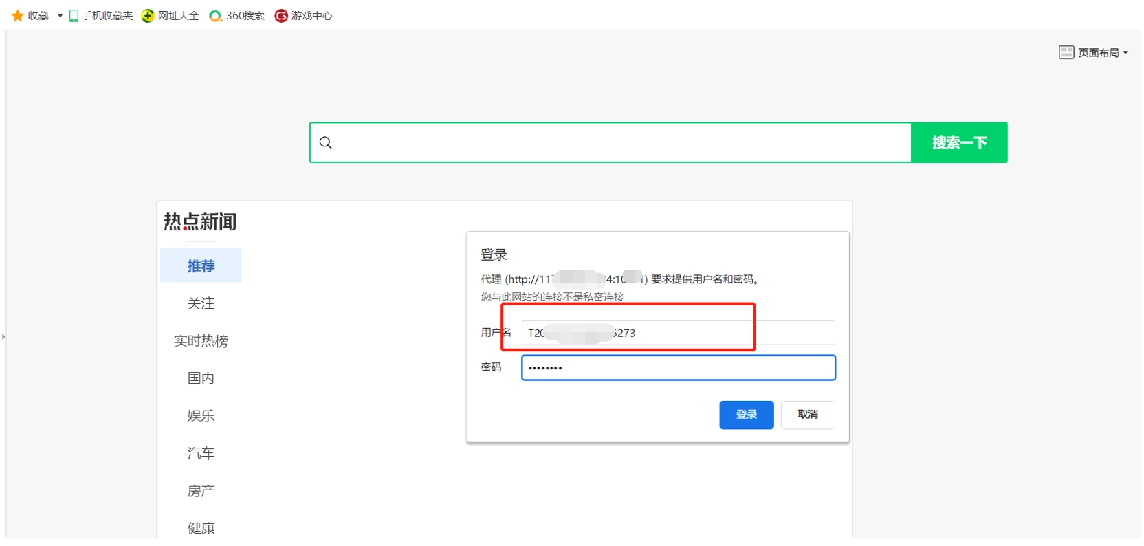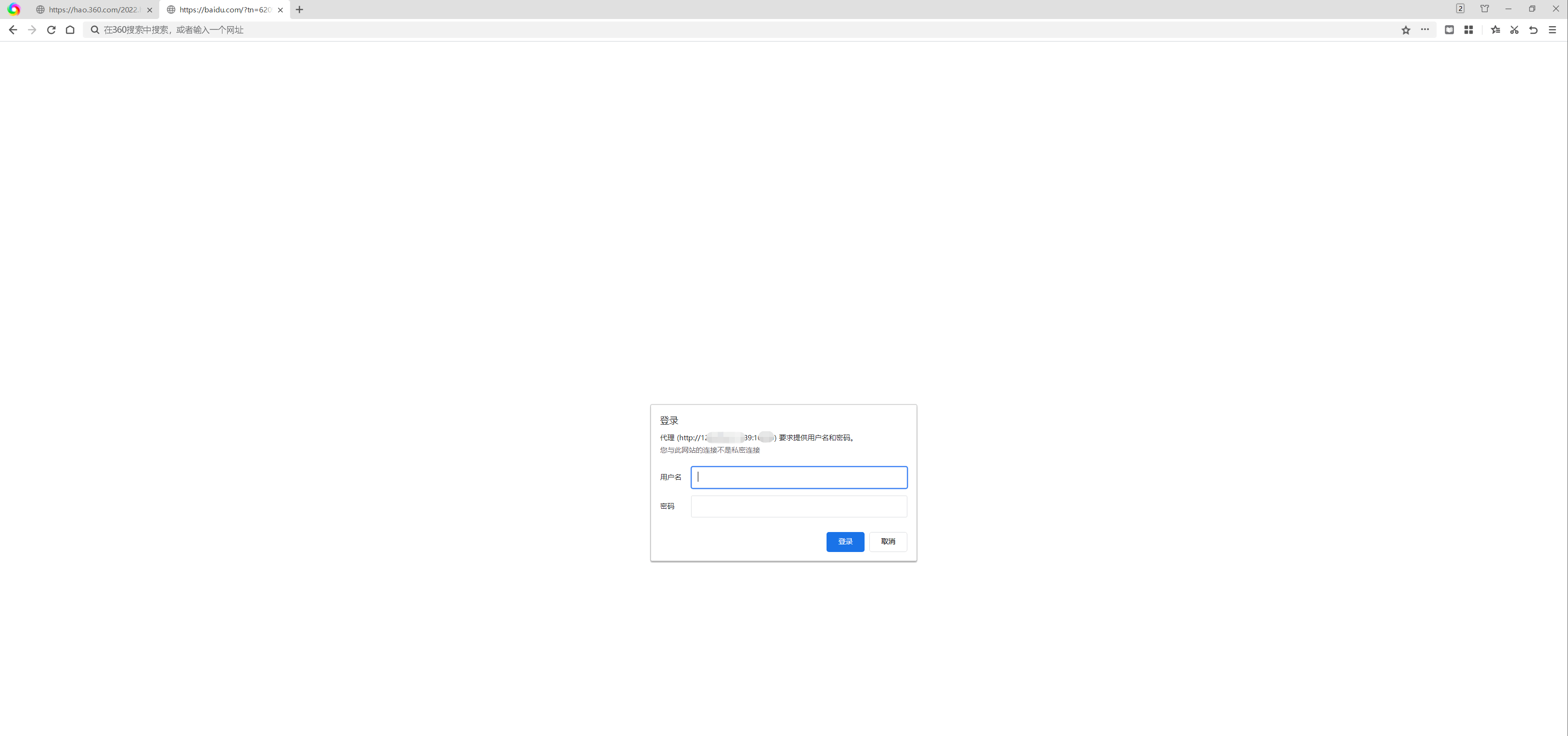 使用360极速浏览器访问网站,在出现登录验证的窗口输入代理用户名和代理密码,点击登录。