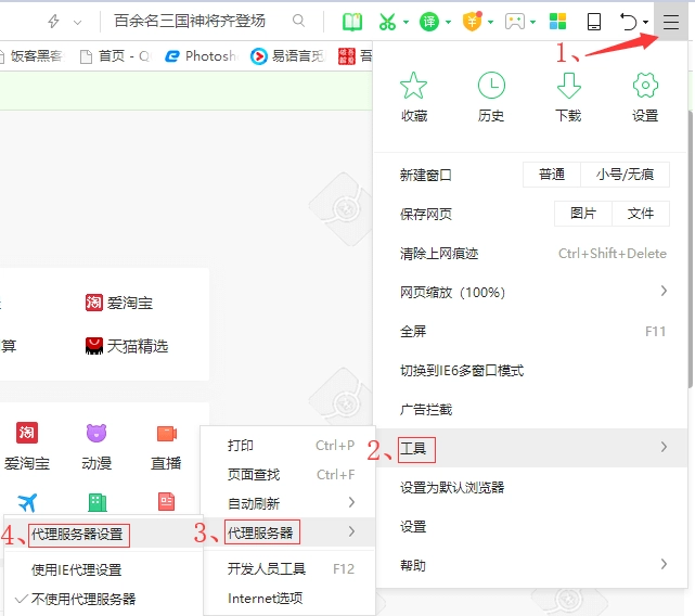 点击右上角菜单;点击工具;点击代理服务器;选择代理服务器设置