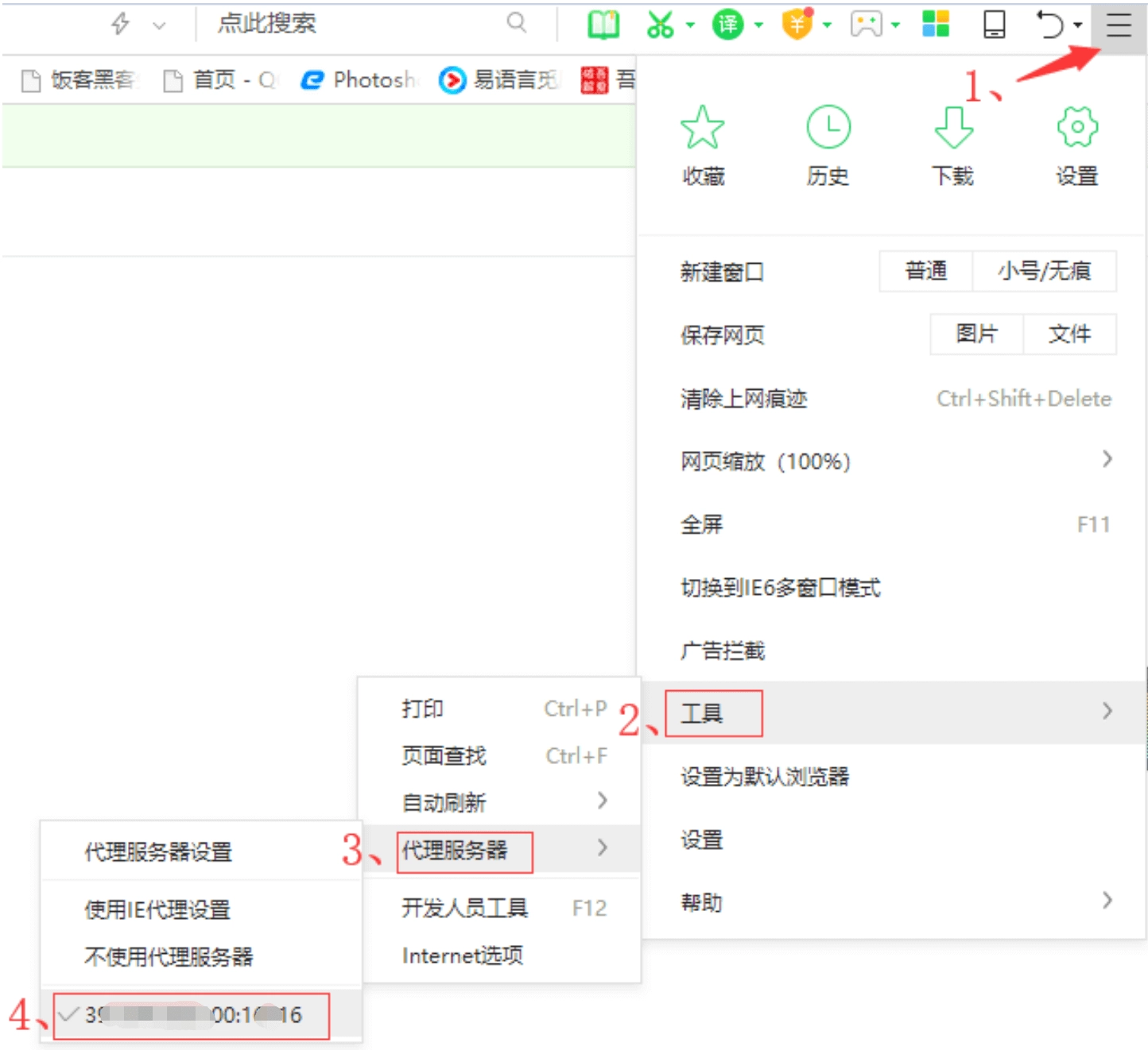 点击右上角菜单;点击工具;点击代理服务器;选择代理的ip和端口